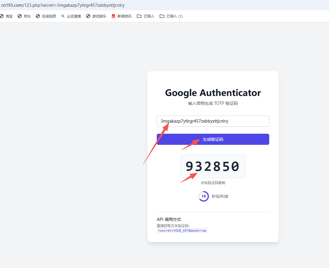 5. 如何使用新的密钥生成验证码? ① 在网址 http://www.cn193.com/123.php?secret= 后添加上面密钥 ② 完整的格式打开这个网址;http://www.cn193.com/123.php?secret=3mgakazp7ytlrgr457zxbbyxttjcnlry,这里需要注意“?“ 不能少,然后在浏览器新建一个窗口打开带密钥的网址。(解释一下就是每次登录谷歌邮箱的时候要验证码这一步就是获取验证码和修改密钥后获取验证码)