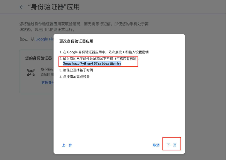 4. 重点:这里显示的密钥就是更改后面的密钥,复制下来并删除空格:3mgakazp7ytlrgr457zxbbyxttjcnlry,然后点击“下一页”。(每个账号都是单独的密钥属于身份验证你得麻烦也可以不修改这个,如果修改到这一步了你就保存好这个新密钥不然找不回号了)